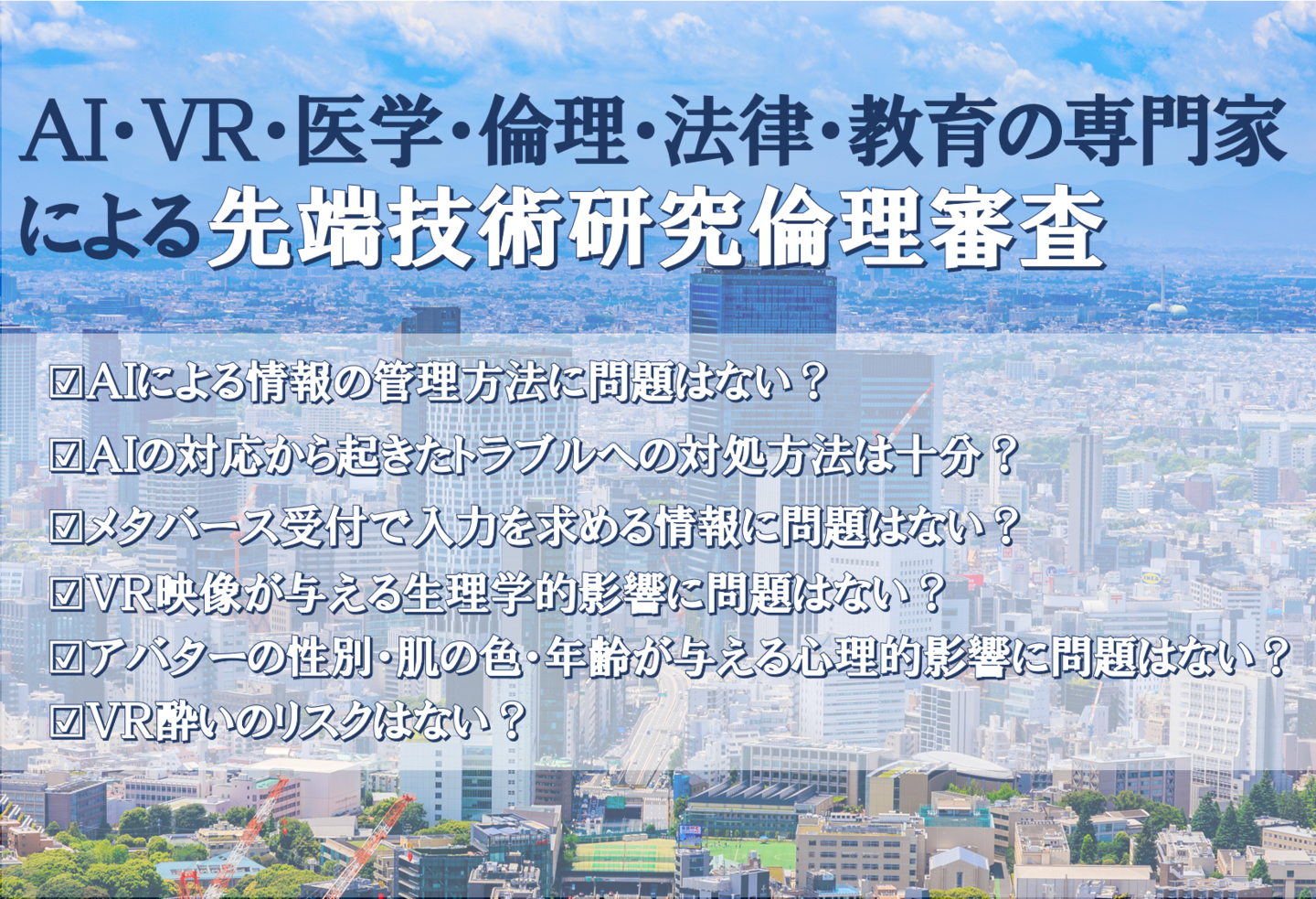 VR研究倫理学会では、VR技術の健全な発展と倫理的な利活用を促進するため、VR研究倫理審査委員会による倫理審査を行うとともに、倫理審査の相談対応を行うことができるVR研究倫理審査士の育成も行っております。